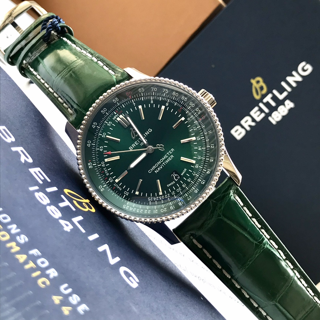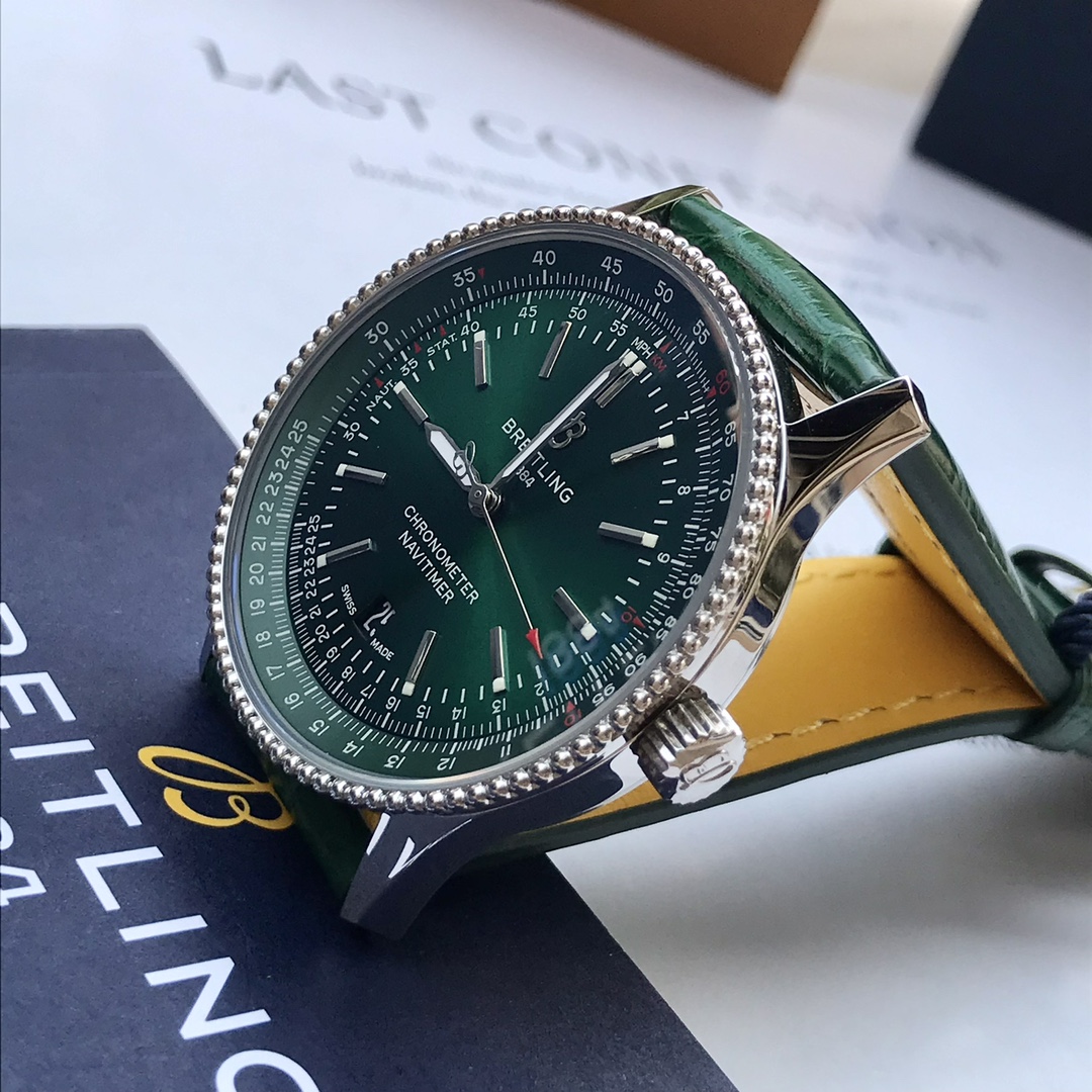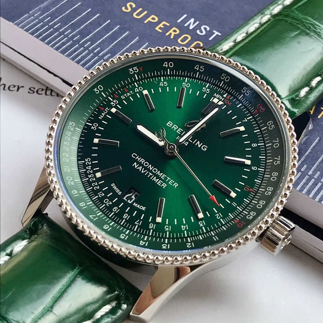 Series:NavitimerModel:A17326361L1P1Colour:GreenCase:MaterialStainless SteelBack:SolidDiameter:41 mmLug Width: 22 mmCalibre:Caliber 17Reserve:38 hoursFrequency:28800 vph