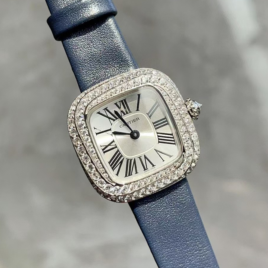 Small Coussin de Cartier watch, quartz movement, 750/1000 white gold case and crown adorned with 166 brilliant-cut diamonds totaling 3.04 carats, case dimensions 27.1 mm x thickness 27.7 mm, case size 7.0 mm. Sword-shaped clock hands made of blued steel Blue calfskin strap White gold buckle 750/1000, rhodium-plated finish, buckle style. Water-resistant to 3 bar (approximately 30 meters).