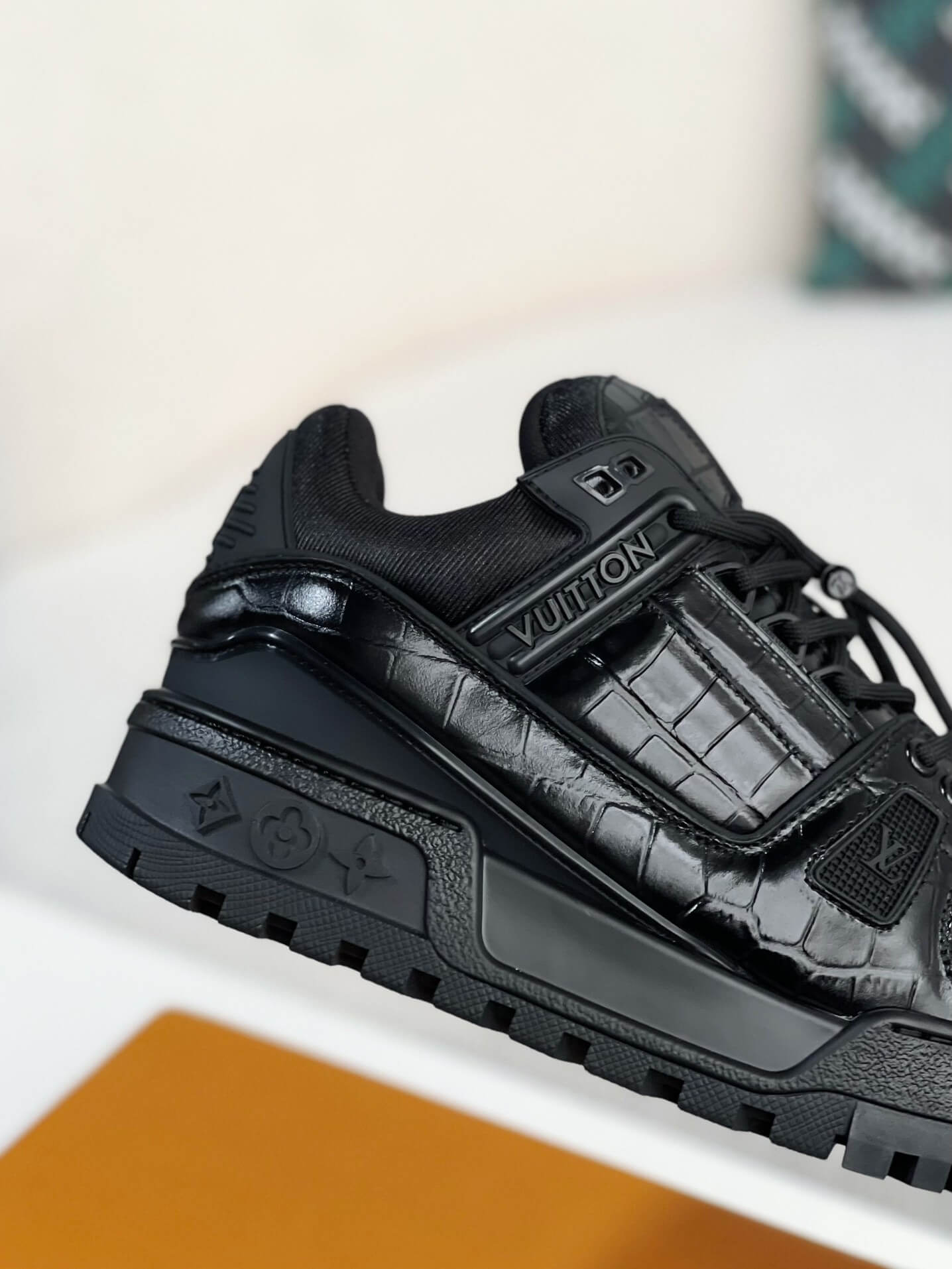 Command attention with these sleek black LV Trainer Maxi-inspired sneakers. This bold and sophisticated design, inspired by Louis Vuitton's iconic silhouette, features an exaggerated sole and luxurious details, creating a statement shoe that's sure to elevate your footwear game. Crafted with meticulous attention to detail, these sneakers offer a premium blend of comfort and high-fashion appeal. The textured leather upper, reminiscent of exotic crocodile skin, adds a touch of exclusivity, while the chunky sole and unique design elements ensure a confident and modern look.