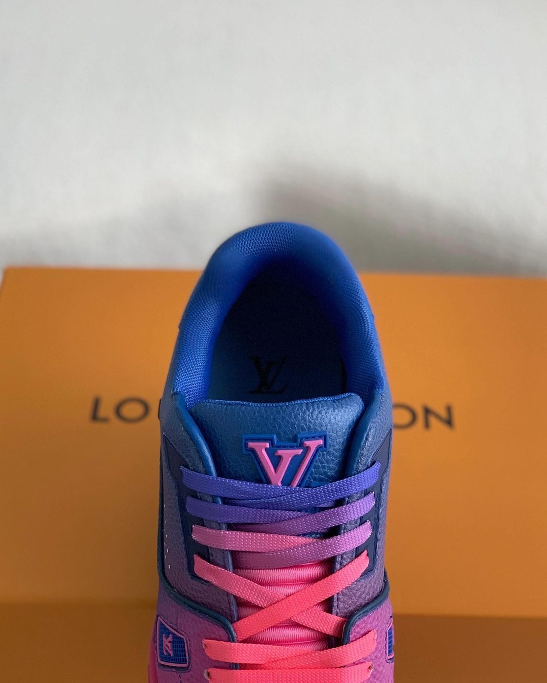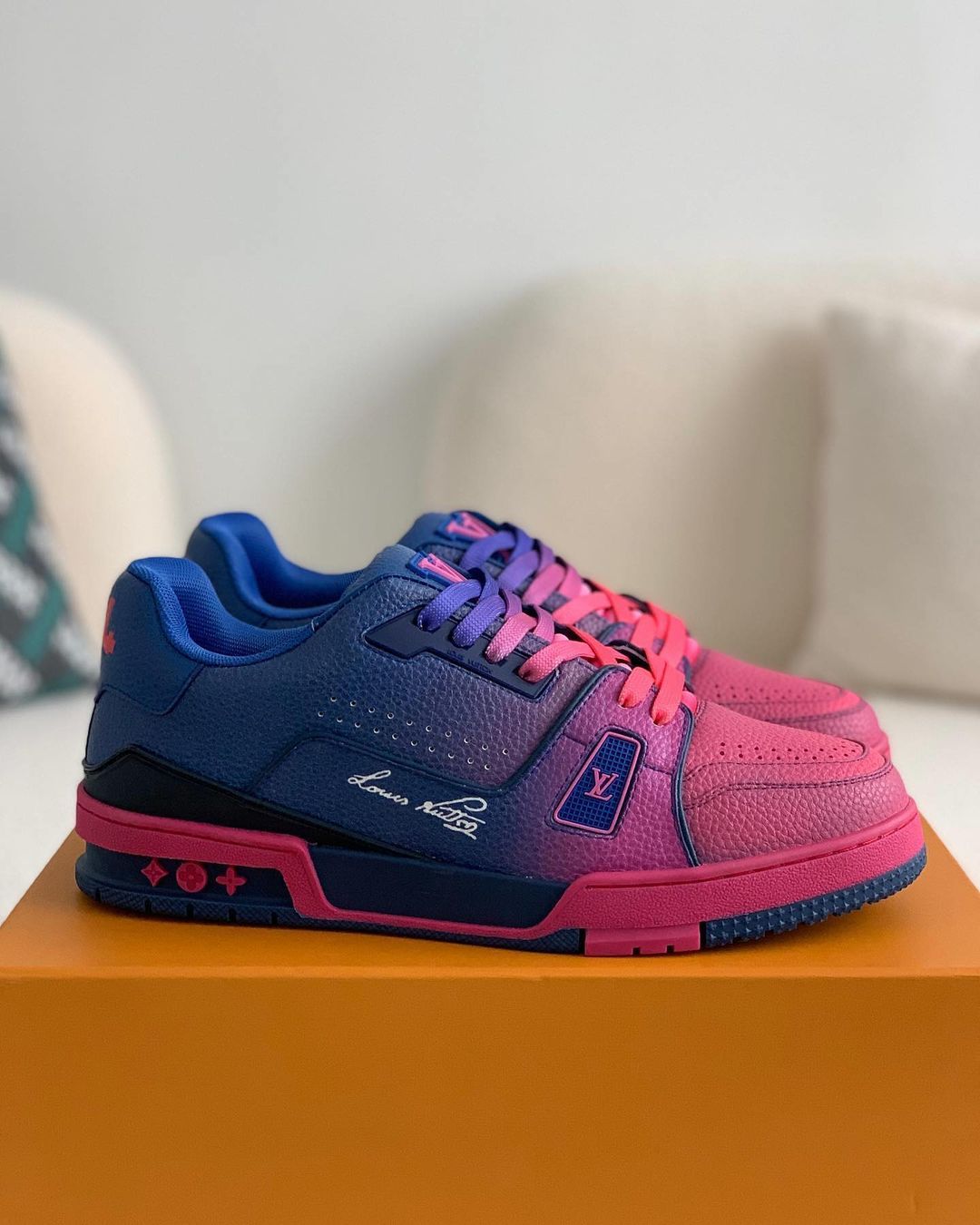 Make a statement with these vibrant sneakers inspired by the iconic Louis Vuitton Trainer. The eye-catching gradient upper transitions seamlessly from deep blue to hot pink, creating a dynamic and energetic look. Premium materials and subtle monogram detailing elevate the design, while the classic low-top silhouette ensures versatile styling.