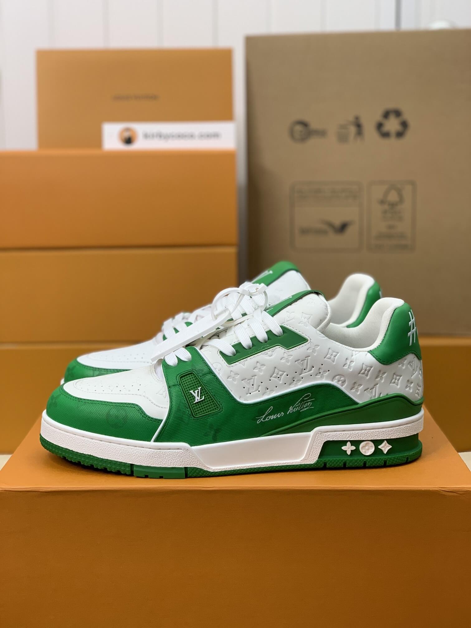 Embrace sporty sophistication with these LV Trainer-inspired sneakers. The striking white and green colorway, accented by the iconic Louis Vuitton monogram, creates a fresh and energetic look. Crafted with premium materials and meticulous attention to detail, these sneakers offer both style and comfort. Perfect for adding a touch of luxury to your everyday wardrobe.