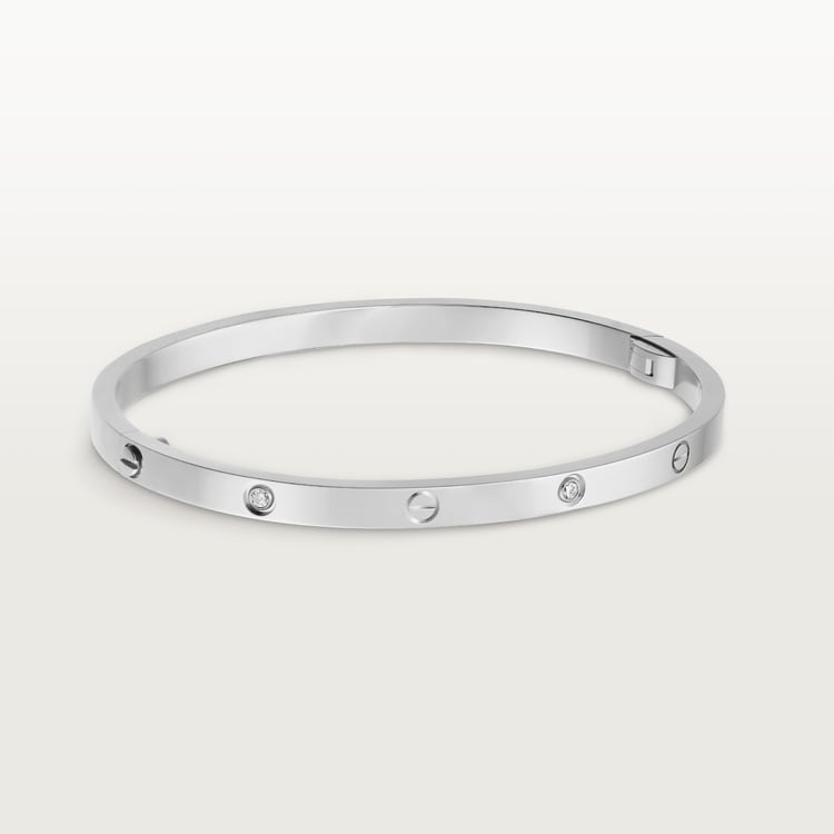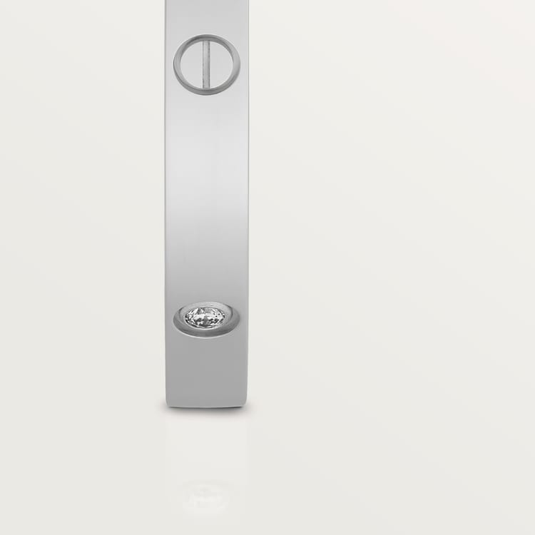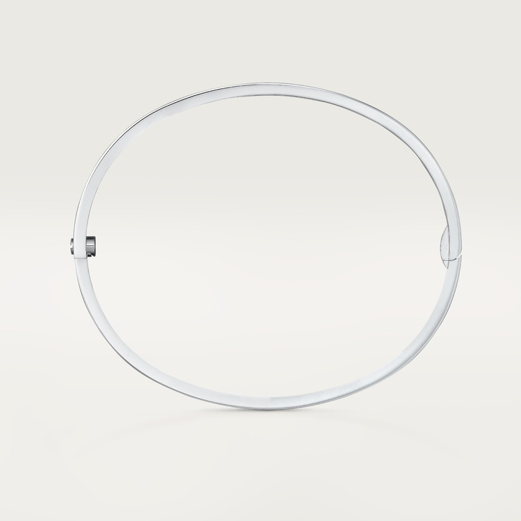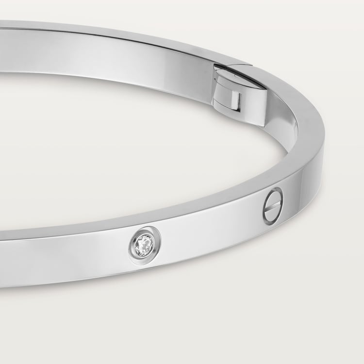 LOVE bracelet, small model, 18K white gold (750/1000), set with 6 diamonds totaling 0.15 carats. Width: 3.65 mm (for size 17). Comes with a screwdriver. Thickness: 2.05 mm (for size 17). The iconic LOVE bracelet has been a symbol of free-spirited LOVE since 1969. Its screw motif and famous locking technology are truly timeless design signatures, while its oval shape ensures a close but comfortable fit to the wearer’s wrist. The locking mechanism consists of a single functional screw on one side of the bracelet and a hinge on the other. Each LOVE bracelet is sold with a matching screwdriver specifically created for this piece. To discover your recommended LOVE bracelet size, please visit our Bracelet Sizing Chart. Add one centimeter to your size for a tight fit, or two centimeters for a looser fit.Please note that the carat weight, number of stones and product dimensions will vary based on the size of the creation you order.For detailed information please