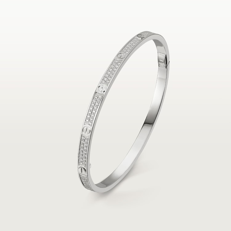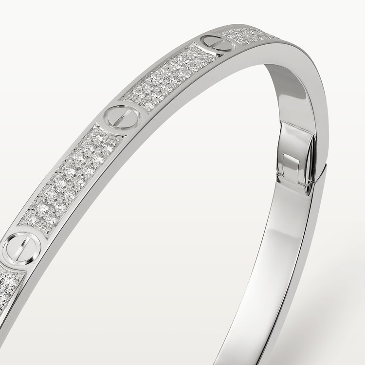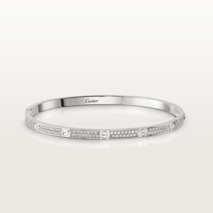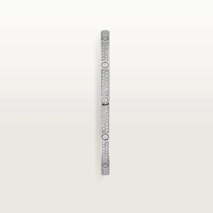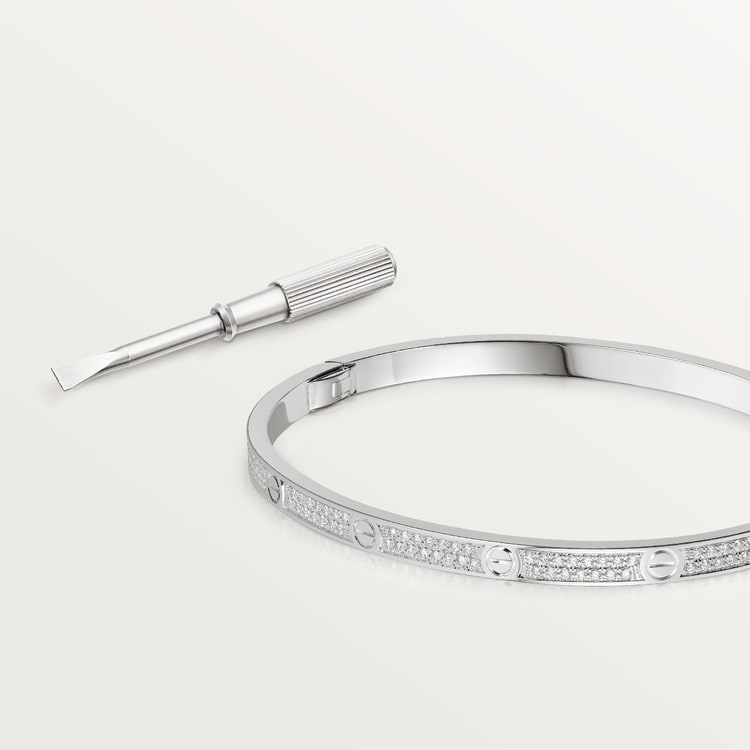 LOVE bracelet, small model, 18K white gold (750/1000), set with 177 brilliant-cut diamonds totaling 0.95 carats. Sold with a screwdriver. Width: 3.65 mm (for size 17). The iconic LOVE bracelet has been a symbol of free-spirited LOVE since 1969. Its screw motif and famous locking technology are truly timeless design signatures, while its oval shape ensures a close but comfortable fit to the wearer’s wrist. The locking mechanism consists of a single functional screw on one side of the bracelet and a hinge on the other. Each LOVE bracelet is sold with a matching screwdriver specifically created for this piece. To discover your recommended LOVE bracelet size, please visit our Bracelet Sizing Chart. Add one centimeter to your size for a tight fit, or two centimeters for a looser fit.