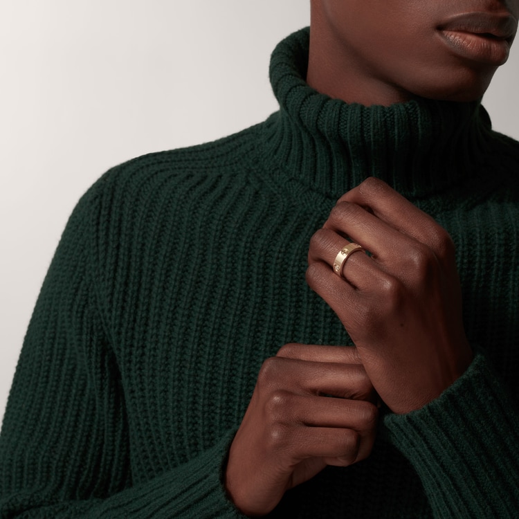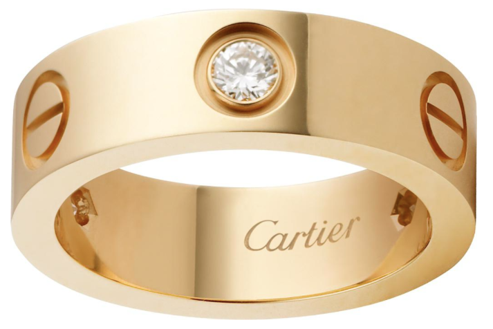 LOVE ring, 18K yellow gold (750/1000), set with 3 brilliant-cut diamonds totaling 0.22 carats. Width: 5.5 mm (for size 52).