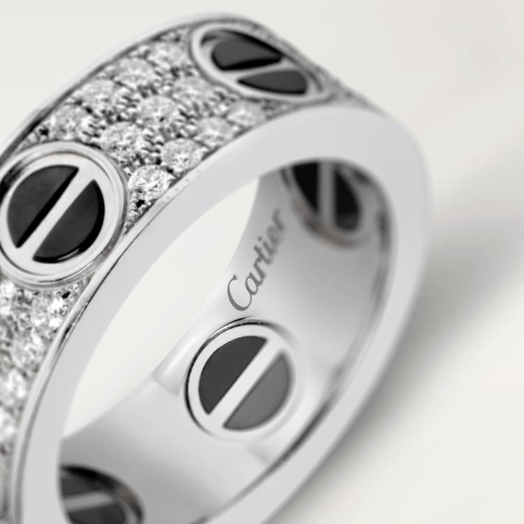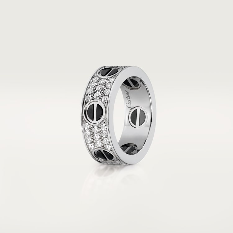LOVE ring, 18K white gold (750/1000), black ceramic, set with 66 brilliant-cut diamonds totaling 0.74 carats. Width: 6.5 mm (for size 52).