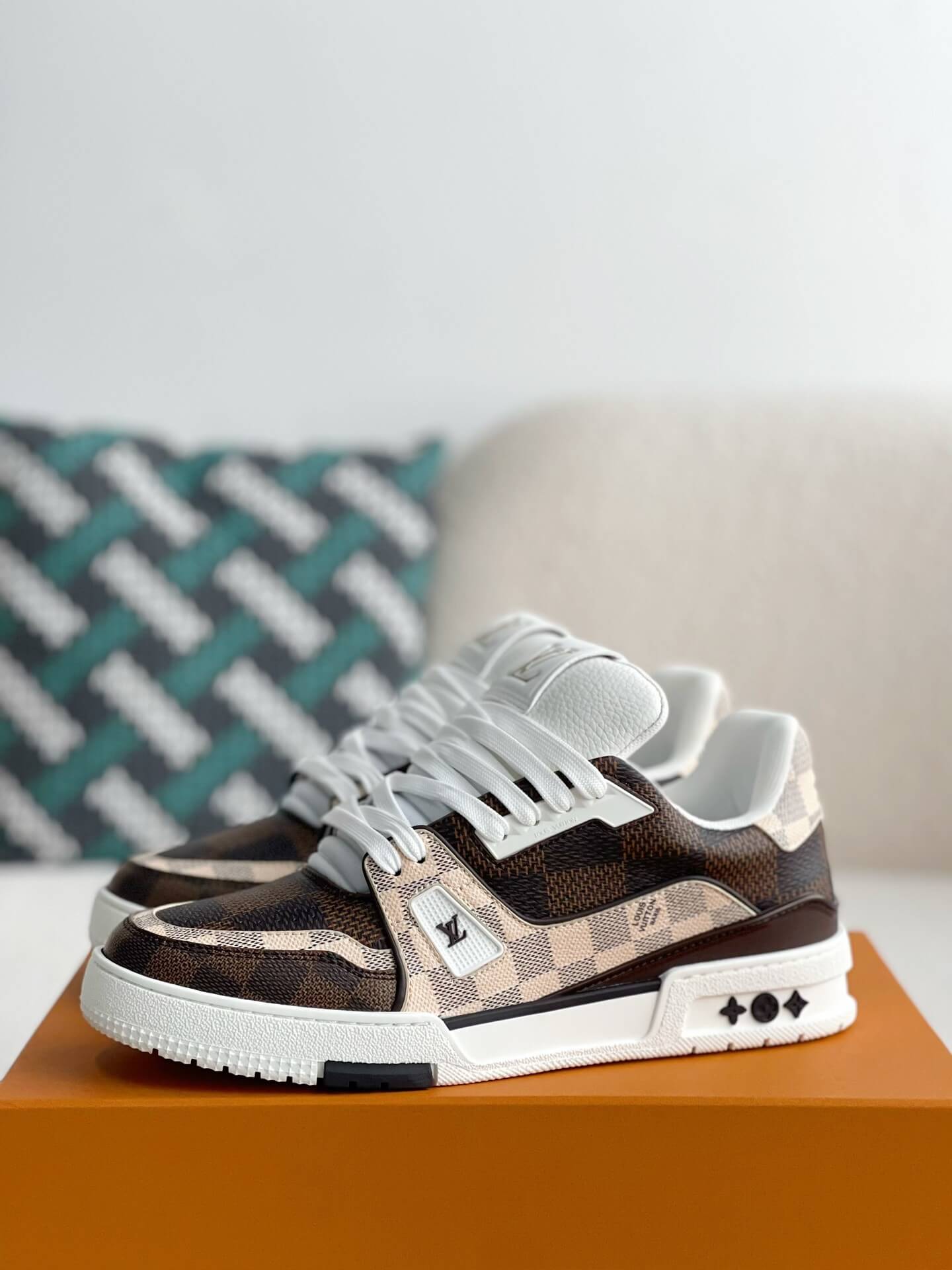 Embrace iconic style with a contemporary twist in these LV Trainer #54-inspired sneakers. The classic low-top silhouette is reimagined with Louis Vuitton's signature Damier Ebene canvas, creating a sophisticated and timeless look. The multicolor detailing adds a playful touch, while the chunky sole and meticulous craftsmanship ensure both comfort and style. Elevate your sneaker game with statement-making shoes that blend luxury and streetwear aesthetics seamlessly.